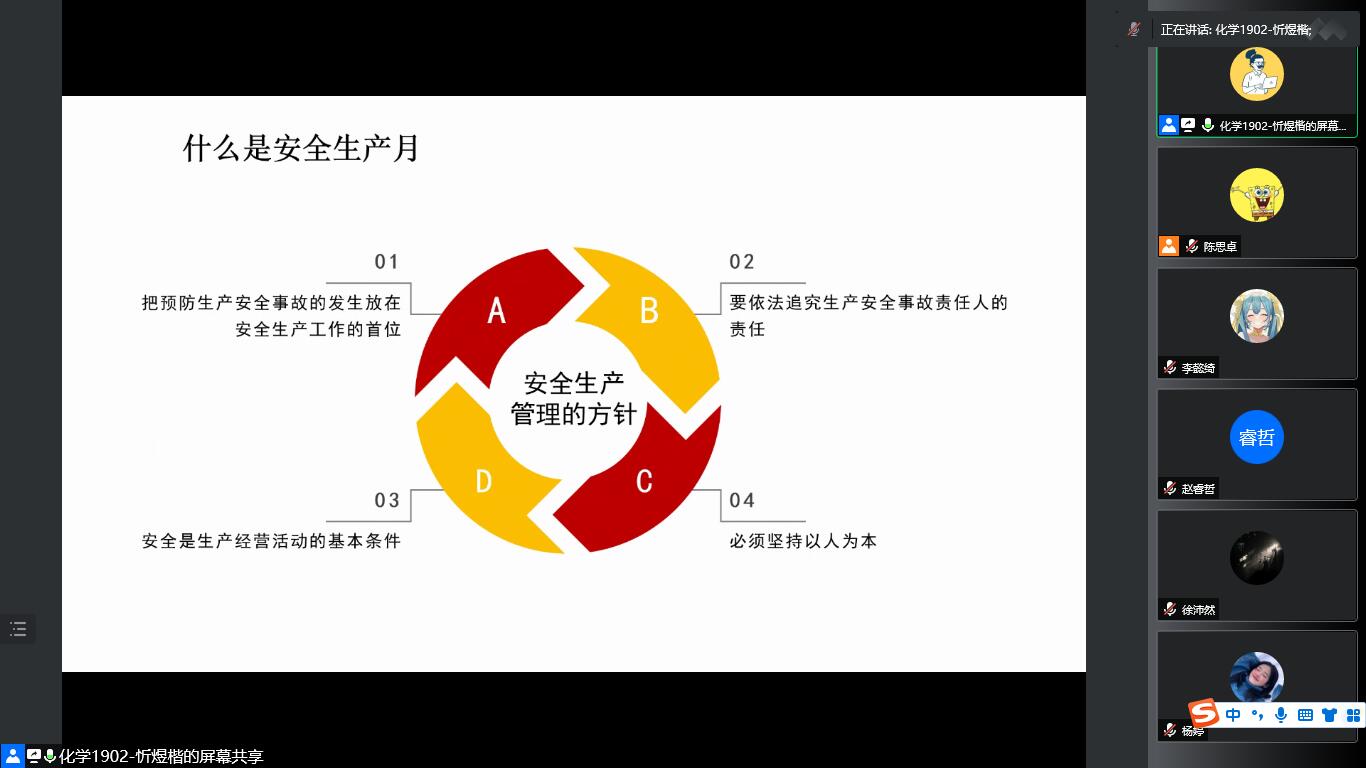 为提高党员的安全意识,本科化学党支部于6月8日晚9点举办了主题为“遵守安全生产法,当好第一责任人”的党日活动,本次活动由支部宣传委员忻煜楷主持。