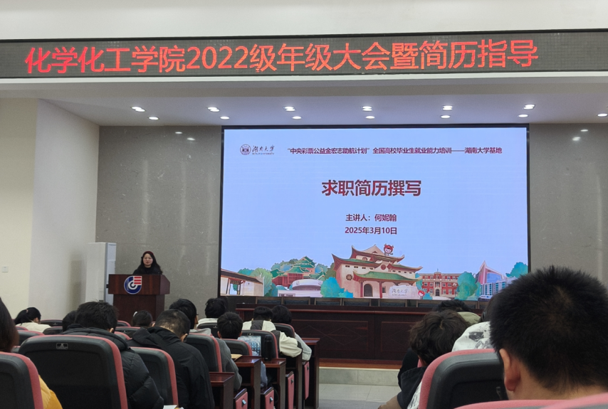 求职简历撰写指导大会于新化工楼D区报告厅顺利举行。本次简历撰写指导大会由本科2022级辅导员何妮翰主讲,2022级全体本科生参与。