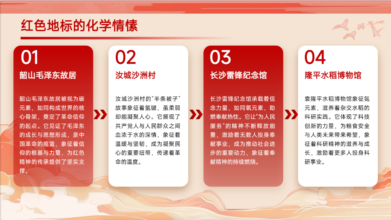 团队根据韶山毛泽东故居、汝城沙洲村 “半条被子” 旧址、长沙雷锋纪念馆、隆平水稻博物馆等核心地标的历史背景与精神内涵,将其与化学元素相结合,以 “碳、氢、氧、氮” 四种元素为象征载体,建立红色地标与学科知识的关联,让红色文化更易被青年学者理解。