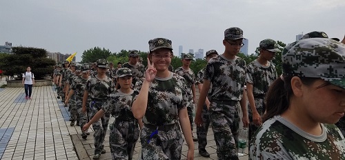 的新生们在哨声下迅速收拾着装紧急集合,并于天马二区篮球场集合整队,在新生班助理的带领下到达南校区体育场。在清点完人数并将伤病员带回后,化工院2019级辅导员夏忠诚老师、各排面教官以及27位新生班助理与新生们一起,踏上了十公里拉练征程。
