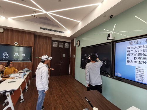 在活动开始前,作为主持人的心理委员石天立前往405教室对所需设备进行调试,布置好现场。随后,同学陆续地在开始时间前到达现场。在准备的游戏开始前,主持人从“破壁”和“自我”两个主题出发,初步地介绍了此次活动的意义,随后同学通过事先小程序随机分的七人大组集合成四个小队来开始团体小游戏。首先是接力版的你画我猜,由三个同学接力画给定的线索,如闭月羞花、落井下石等成语,火锅、直升机、篮球等常见名词,甚至有身边同学和老师的名字,使得不仅考验的是画者之间的配合和画功,而且给游戏增添了难度和趣味性,现场笑声接连不断。