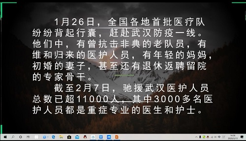 首先,班长张帝同学致词并由自律委员同学进行考勤之后,团支书魏婕鑫同学借此次疫情情况,介绍了党中央在此次疫情中的努力及部署,让同学们知道了党的英明决策,并且魏婕鑫同学叮嘱同学们要了呆在家中,认真学习,同时保护自己。