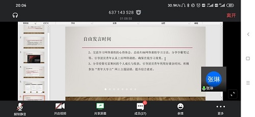 在接下来的活动中,同学们围绕着“抗疫”和“网课”进行了积极的思考和热烈的讨论与交流,多位同学从抗疫期间自己的所见所闻,连麦发表了自己的感想。张琳同学分享了疫情期间自己看到的一些不好的现象,呼吁作为大学生我们要约束自己的言行,做到“不信谣,不传谣”。林婕同学分享了“停课不停学”期间的感受,也针对如何利用好网课,提高学习效率提出了自己的建议。