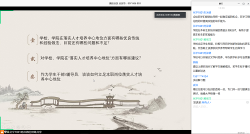 之后,班长提出了三个问题:(1)学校、学院在落实人才培养中心地位方面有哪些优良传统和经验做法,目前还有哪些问题和不足?(2)对学校、学院在“落实人才培养中心地位”方面有哪些建议?(3)作为学生干部\辅导员,谈谈如何立足本职岗位落实人才培养中心地位。同学们紧紧结合活动与学习生活,通过腾讯会议讨论区展开积极讨论,以提出建议为主,建议中以本科生科研为主,体现了同学们不满足于书本上的知识,对自己有更高的要求,希望在大学这四年中得到更多的发展。