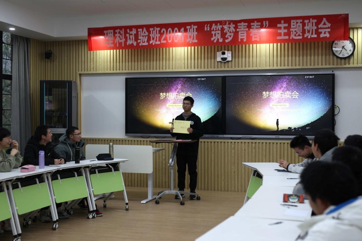 班会首先由大学生活理想与实际的落差引入,引起了同学们的共鸣,进一步引出筑梦主题。在首先的梦想拍卖会环节,“梦想拍卖官”徐博同学依次展示不同的“梦想拍卖品”,如实地考察的实践工作人员、醉心实验的科研人员等。同学们用自己手中的筹码竞拍。拍卖结束后,徐博对拍卖结果进行了分析,激发同学们对自己梦想的思考。