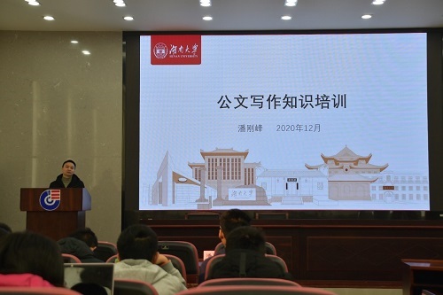 12月6日上午,潘刚峰老师为大家进行第三项培训内容——公文写作,旨在锻炼学生领导指导和联系公务的能力,规范学生言行,正确传达上级,学校的政策和规定。潘老师介绍了什么是公文写作,公文写作的意义,公文拟写以及公文写作的中心原则等方面内容,并用生动活泼的方式为大家介绍了如何解决学生干部在公文写作中的困境,指出学生干部掌握公文写作方法和提高写作能力是一项重要的基本素质和能力。最后潘老师建议学生干部争取保研的机会,努力学习力争上游,学会平衡好学习生活以及工作之间的关系,希望各位同学能够学业有成,工作顺利。