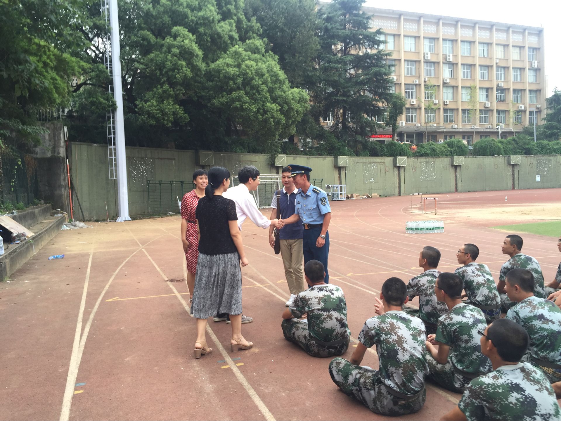 院长蒋健晖教授,院党委书记王玉枝教授,院党委副书记陈义红老师和16级新生辅导员陈晓晖老师来到训练场地,对正在训练的新生们以及陪同训练的教官进行了亲切的慰问。