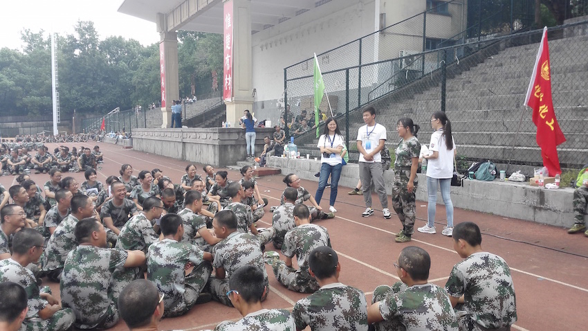 应用化学1601班的程睿同学军训时因为身体不适而到一旁休息,在休息时间里她发现班上的同学们有点精神萎靡,疲惫不堪。程睿便挺身而出唱了一首歌给同学们听,帮助他们舒缓心情,希望他们能在这片刻的时光里暂时忘却军训的烦恼与痛苦。还有同样助人为乐的来自化学1603班的陈泽玮同学,他由于高中对寝室内务的严格要求对叠军被已能够十分熟练地掌握,因而他也会耐心地教其他同学叠好军被,整理内务。不仅如此,他还曾体贴地为紫外线过敏的女生遮住阳光。这样的新生也已经越来越多,新生们自行拧成了一股绳,团结一致,共同努力,一起齐心协力挺过军训这道难关。