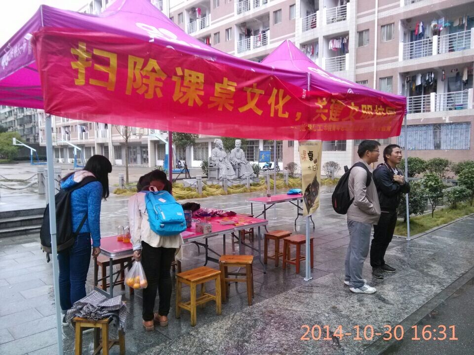 活动原定时间为十二点半,但由于下大雨,延迟了半个小时。虽然地上很潮湿,有很多积水,天空还下着丝丝细雨,但志愿者们都十分热情。在化工院青协部长石倩的带领下,志愿者们很快摆好了桌子,搭起了帐篷,贴好了横幅,热情等待着来往同学们前来报名参与。