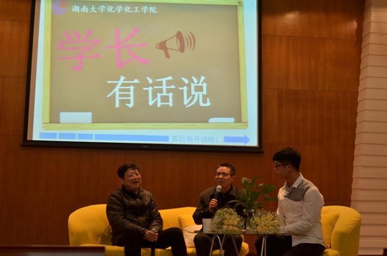 主持人依旧是经验丰富的吴天忍学长,首先向大家介绍了这两位出自化工院而如今功成名就的学长,并让他们分别就自己的现在工作谈了谈概况。夏处长主要负责后勤保障和房地产管理工作,说白了,就大家关心的空调问题等一系列与大家息息相关的问题都是其工作内容,处长保证这个学期会让大家用上空调,大家掌声一片。而唐部长作为一名理工科学生,在文学方面造诣颇深,是作家协会的会员和校新闻发言人,主要负责思想,新闻和文化三大块的工作。