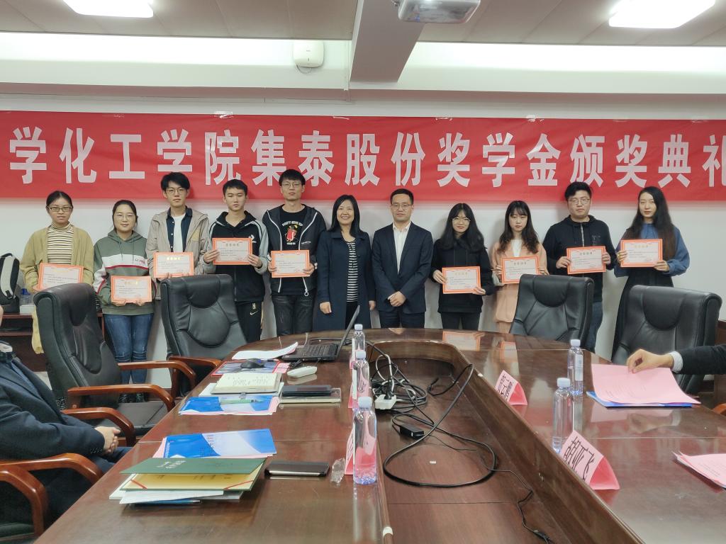 2019-2020学年度“集泰股份奖学金”颁奖典礼在新化工楼D204会议室举行。参加颁奖典礼的领导和嘉宾有广州集泰化工股份有限公司研发管理部经理胡亚飞、人力资源部副总经理刘丹丹、长沙办事处总经理贺云鹏、经典三级