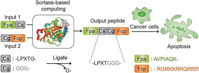 生物计算作为一个信息处理工具在多参数传感和生物医学方面显示巨大的潜力。长期以来,生物分子逻辑门获得了科学界的广泛关注,然而在以往的研究中,大多数的工作都还局限于DNA分子逻辑门,而多肽逻辑门却因其氨基酸残基多样且复杂的化学性质而鲜有报导。因此,亟需开发一种通用型多肽生物逻辑系统,执行更复杂而精准的逻辑调控。日前,我校经典三级 、化学生物传感与计量学国家重点实验室聂舟教授研究团队报道了一种新颖的复杂多肽逻辑系统,将转肽酶Sortase A作为通用生物处理器,成功实现了细胞行为的调控。