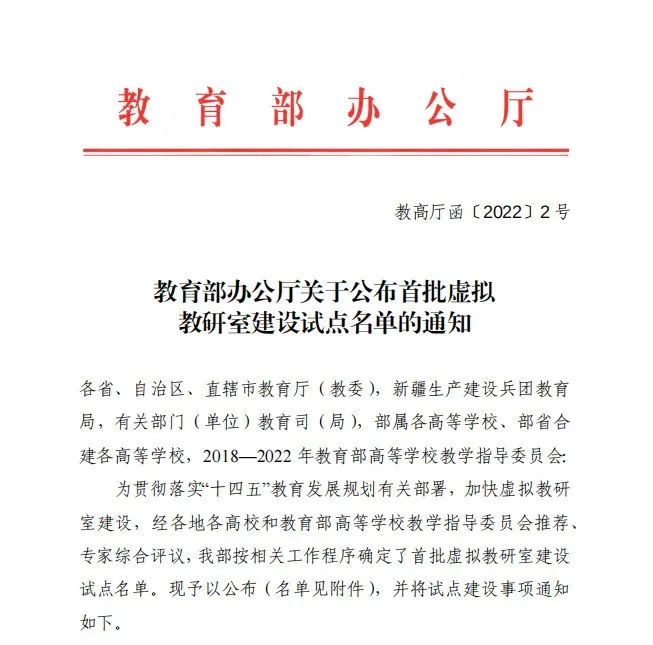 近日,教育部办公厅公布首批虚拟教研室建设试点名单,我校4个虚拟教研室获批,位居全省第一,经典三级