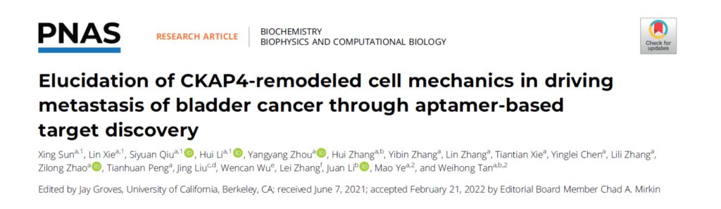 分子科学与生物医学实验室(MBL)的叶茂/谭蔚泓教授团队在《美国科学院院刊》(PNAS)杂志发表题为“Elucidation of CKAP4-remodeled cell mechanics in driving metastasis of bladder cancer through aptamer-based target discovery”的文章,开拓了膀胱癌力学研究的新方向,为膀胱癌的防治提供了新思路。