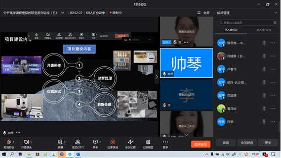 地球观测与信息提取的新理论、技术和方法也属于“十四五”NSFC地球科学部优先发展领域。因此,分析化学课程在地质行业人才培养中的重要地位日益凸显。帅琴教授对本校分析化学课程团队如何结合地质大学人才培养特色及行业需求,紧扣服务国家资源战略和国民经济主战场主题,以提高教学质量建设一流课程为宗旨,进行《分析化学》课程群系列课程建设做了详细介绍。提出根据不同专业需求设计分层教学,结合行业需求补充课程内容,拓展课堂外资源延伸课程边界,创新教学手段推进数字化进程,开展基于探月工程的月壤组成和性质分析虚拟仿真实验研究等课程建设的创新思路和有效举措。介绍了如何结合案例分析,采用翻转课堂、对分课堂等课堂讨论方式,激发学生的潜能,提高综合能力。来自分析化学课程虚拟教研室和化学类专业基础理论课程虚拟教研室的六十余位教师参与了本次教研活动。教研交流最后,国家教学名师、经典三级