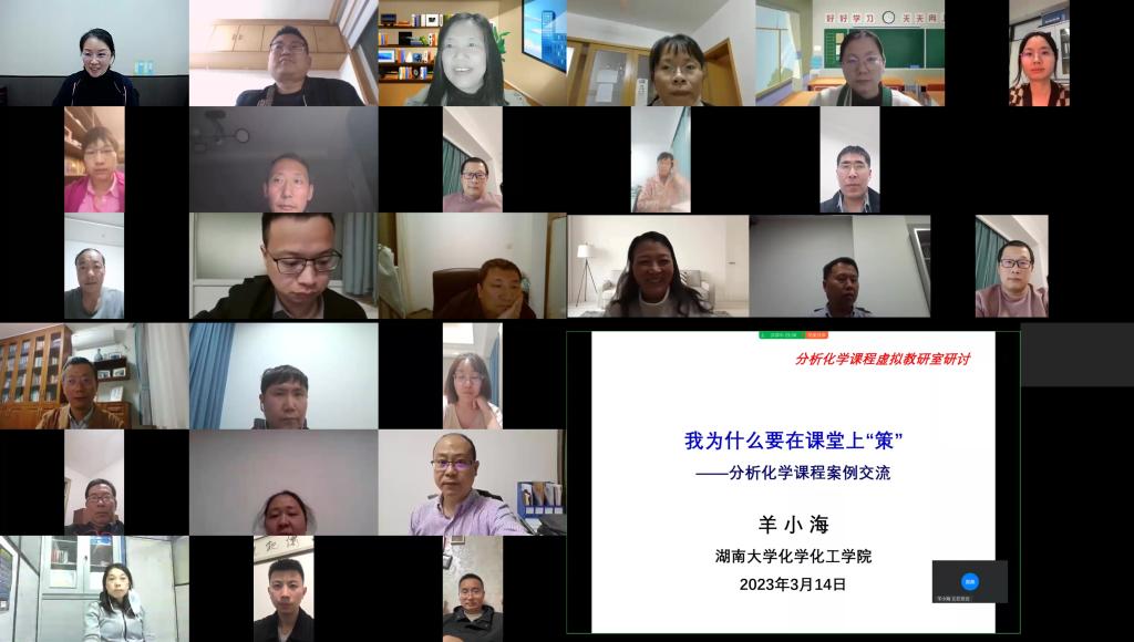 羊老师的报告给分析化学课程教学带来新的思路,“策”是一种吸引学生兴趣的手段,采用学生喜欢的方式来讲述分析化学的理论,传递学科思维和育人思想。讲座最后,国家教学名师王玉枝教授做了总结发言,并对分析化学虚拟教研室前期资源建设和迁移、本学期工作设想进行了介绍。本教研室将继续开展系列教研讲座活动,推进分析化学知识图谱建设,不断增加课程思政和学科前沿教学案例设计,探索教学创新设计、教学评价研究、教师发展研究和教材编写研究工作,开展同步课堂活动。