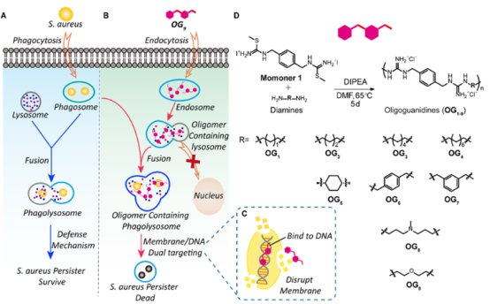 为了解决这一问题,冯欣欣副教授团队提出了一种策略,即精确定位金黄色葡萄球菌泡囊,以根除这些持久存活的细菌。因此,该团队设计并合成了一种具有双重抗菌机制的寡聚胍类抗菌肽模拟物,用于精确定位和根除吞噬体溶酶体腔中的金黄色葡萄球菌。这项研究不仅证实了这种策略可以最小化这种抗菌模拟物与其他细胞器的相互作用,从而提高了其生物相容性,还从化学生物学角度揭示了抗菌化合物的精确定位在提升细胞内抗菌效力上的重要性,为未来的细胞内杀菌系统开发提供了理论基础。