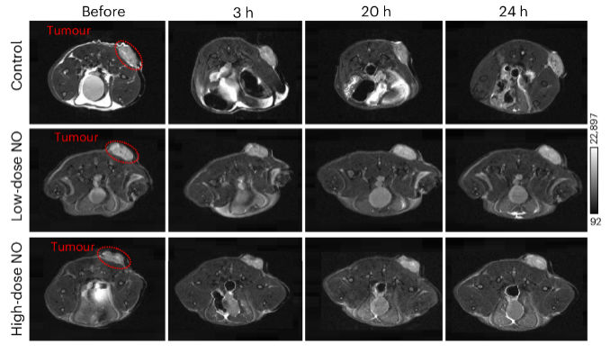 图2、磁共振成像小鼠肿瘤中的一氧化氮图片。