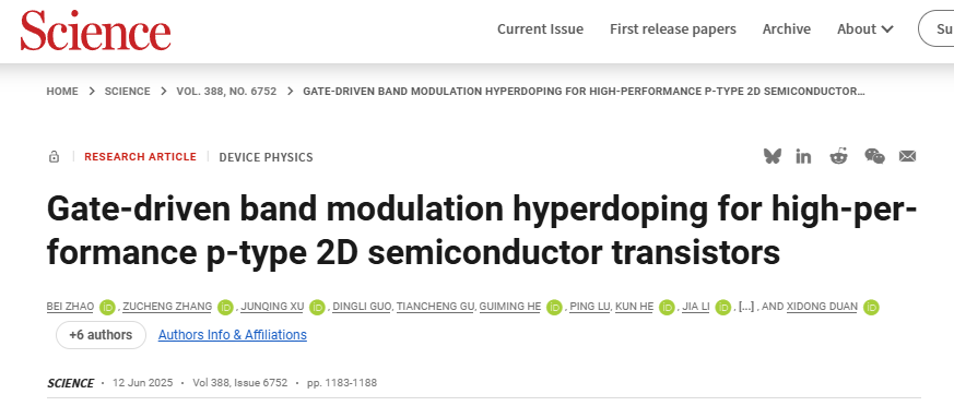 研究成果以“Gate-driven band modulation hyperdoping for high-performance p-type 2D semiconductor transistors” 为题发表在Science上。经典三级