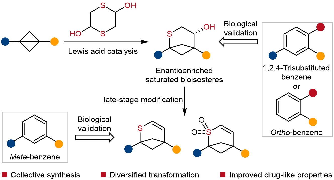 冯见君教授团队报道了一项研究成果。在前期工作的基础上,团队成员创新性地开发了路易斯酸催化双环丁烷(BCB)与廉价巯基乙醛二聚体(<0.28元/克)的(不对称)[3+3]环加成反应,以100%的原子经济性、优秀的对映选择性构筑了具有两个或三个出口向量的硫杂双环[3.1.1]庚烷骨架。该骨架可分别作为邻位取代和1,2,4-三取代苯环的饱和生物电子等排体;通过后期官能团转化还可衍生出包括1,5-二取代硫杂双环[3.1.1]庚烯在内的多样化学空间,用于模拟间位取代苯。该研究不仅首次实现了1,2,4-三取代、邻位及间位取代苯环的饱和生物电子等排体的集群式合成,而且填补了硫杂双环烷烃作为苯环饱和生物等排体研究的空白。