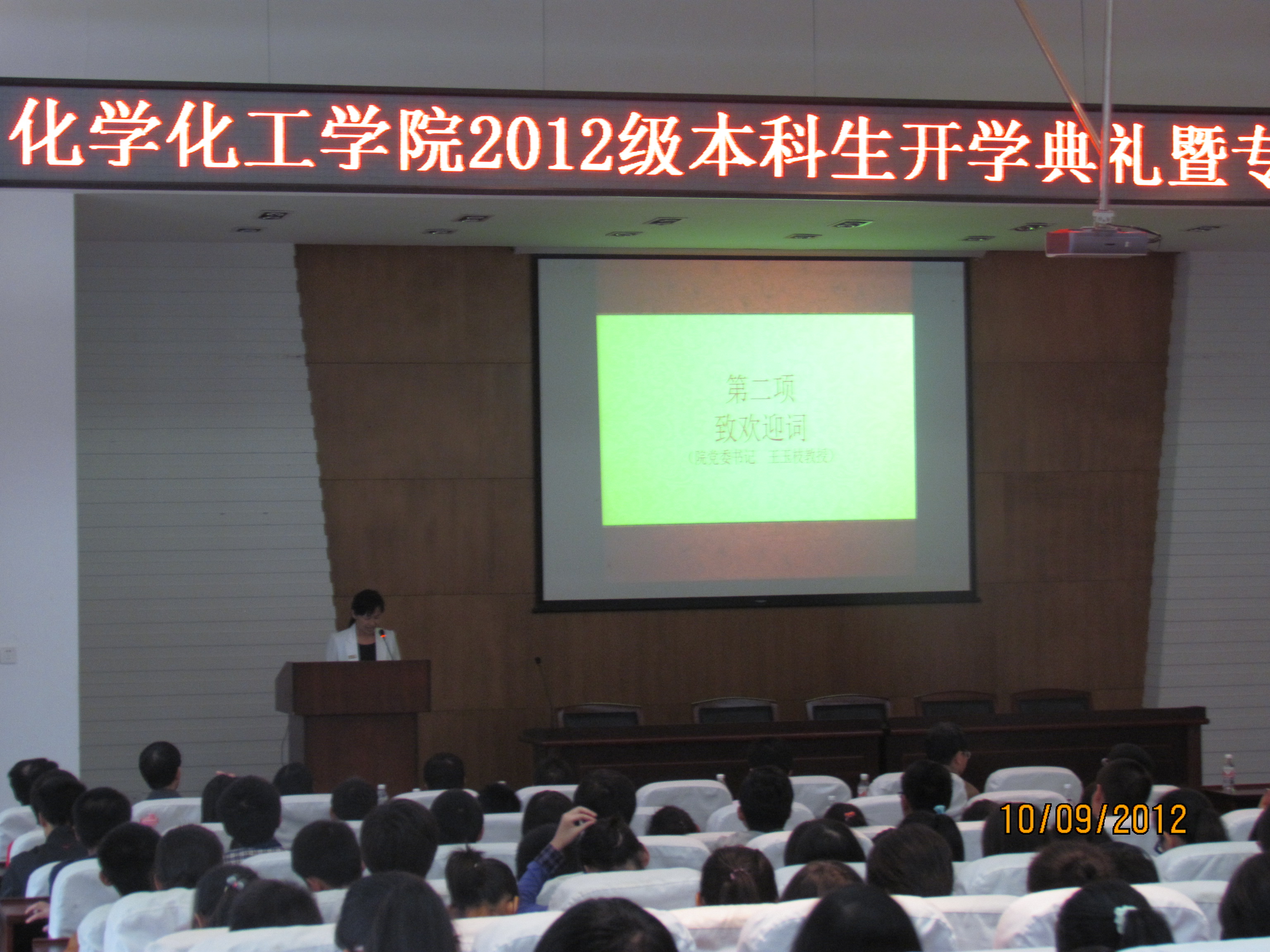 陈义红副书记宣布开学典礼正式开始,并一一介绍与会各位领导、老师后,王玉枝书记饱含深情向全体新生致欢迎词,王书记代表学院表达了对2012级本科生的热烈欢迎,对新生提出了数点希望和嘱托,同时号召全体新生继承和发扬化工院的优良传统,保持化工人学习和科研的热情,锻造化工人高尚坚毅的品质,树立化工人严谨细致的态度,提高化工人求真务实、奋力拼搏的意识。王书记的谆谆教诲深刻印在同学们的脑中,为新生指明了前进的方向和奋斗的目标。接着,蒋健晖院长从学院历史沿革、组织机构、本科生及研究生人才培养、科研基地与平台、师资力量、本科教学质量工程、学科地位、科学研究、学生工作等十个方面,详细地向新生介绍了学院的基本情况,引起与会老师和学生的广泛共鸣,尤其在谈及分析化学和电化学的国际地位时,新生纷纷流露出赞叹的表情。