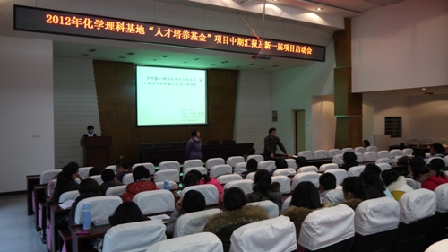 在新化工楼D区报告厅召开了化学理科基地“人才培养基金”项目2010级中期汇报及2011级项目启动会,2010级与2011级化学基地班、本硕班同学以及2011级基地项目指导教师参加了会议。