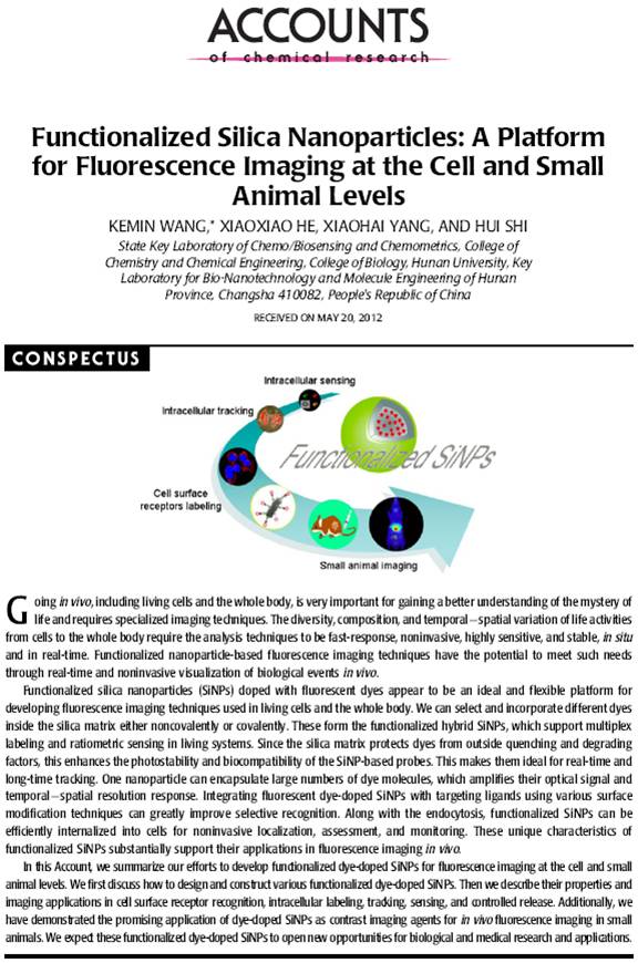 此文总结了王柯敏教授课题组自2000年以来在生物功能化纳米颗粒荧光成像探针设计与制备及其在细胞、亚细胞和小动物活体荧光成像等方面的研究探索。Accounts of Chemical Research杂志在化学研究领域深具影响(2012年影响因子为21.64),被认为是化学化工领域顶级综述性杂志之一,主要是综述作者自己的系统研究而不同于其它综述性杂志。