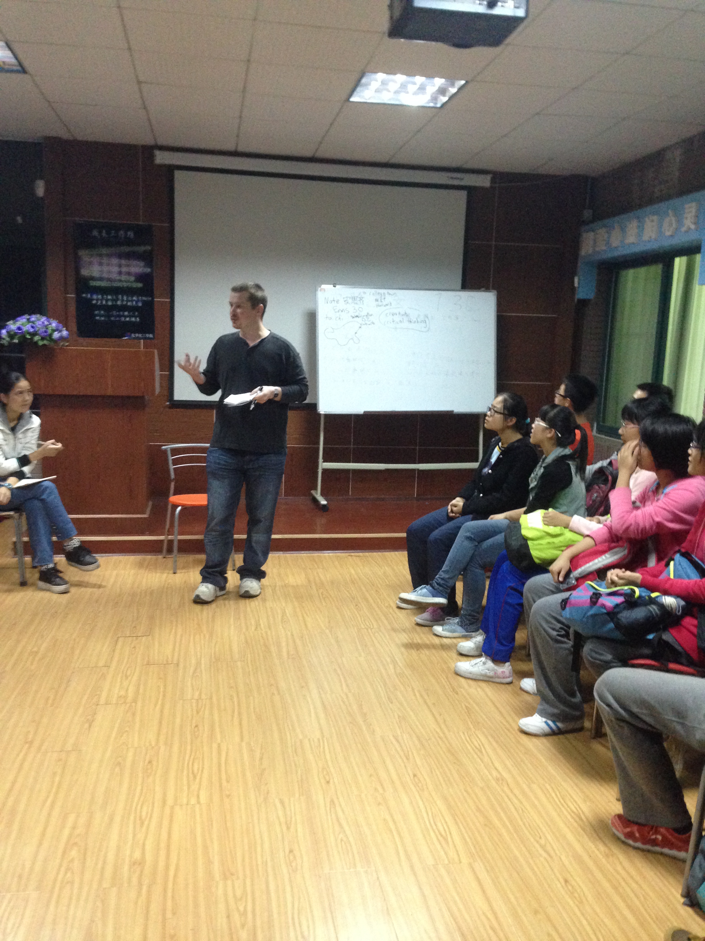 活动后期,同学们以最热情的方式和Nate做思想和文化上的交流。从美国大学生的恋爱到美国人眼中的吸血鬼,从美国大学生的兼职经历到中国留学生的生活状态,从美国人第一次来中国的感受到美国人在中国的游记,从运动到学习,从生活到社会,从文化到政治,Nate朋友都一一同大家做了交流。可以说,这是化工学子在本期工作坊中看到了老师、课本、同学、社会中都学不到的视角。