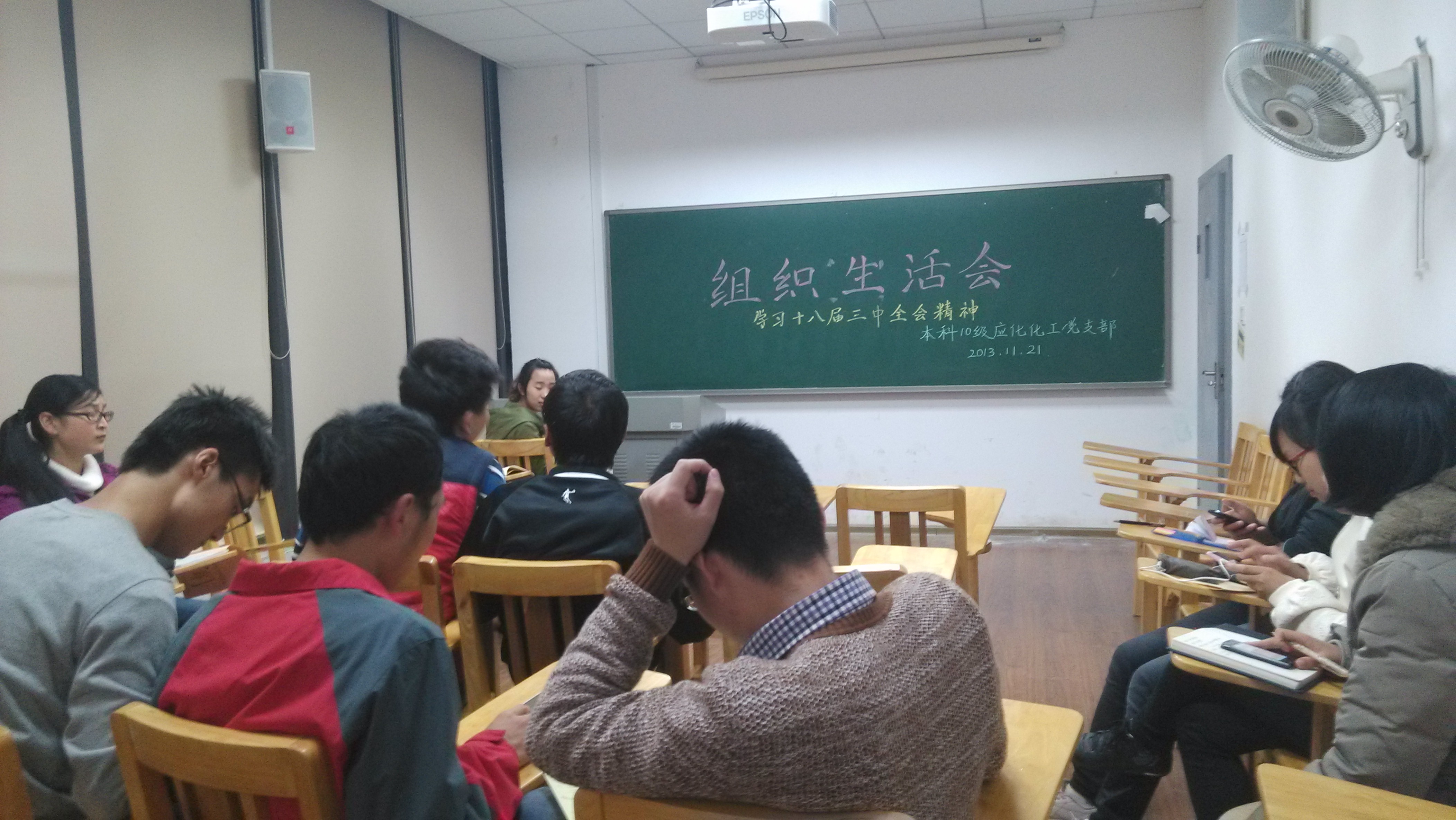 本科10级应化工艺党支部全体成员在综合楼412组织召开了本学期的组织生活会,会议由支部书记张帅主持。会议主要组织支部党员学习了十八届三中全会的重要精神,并对此次全会的理解和体会发表了自己的看法。