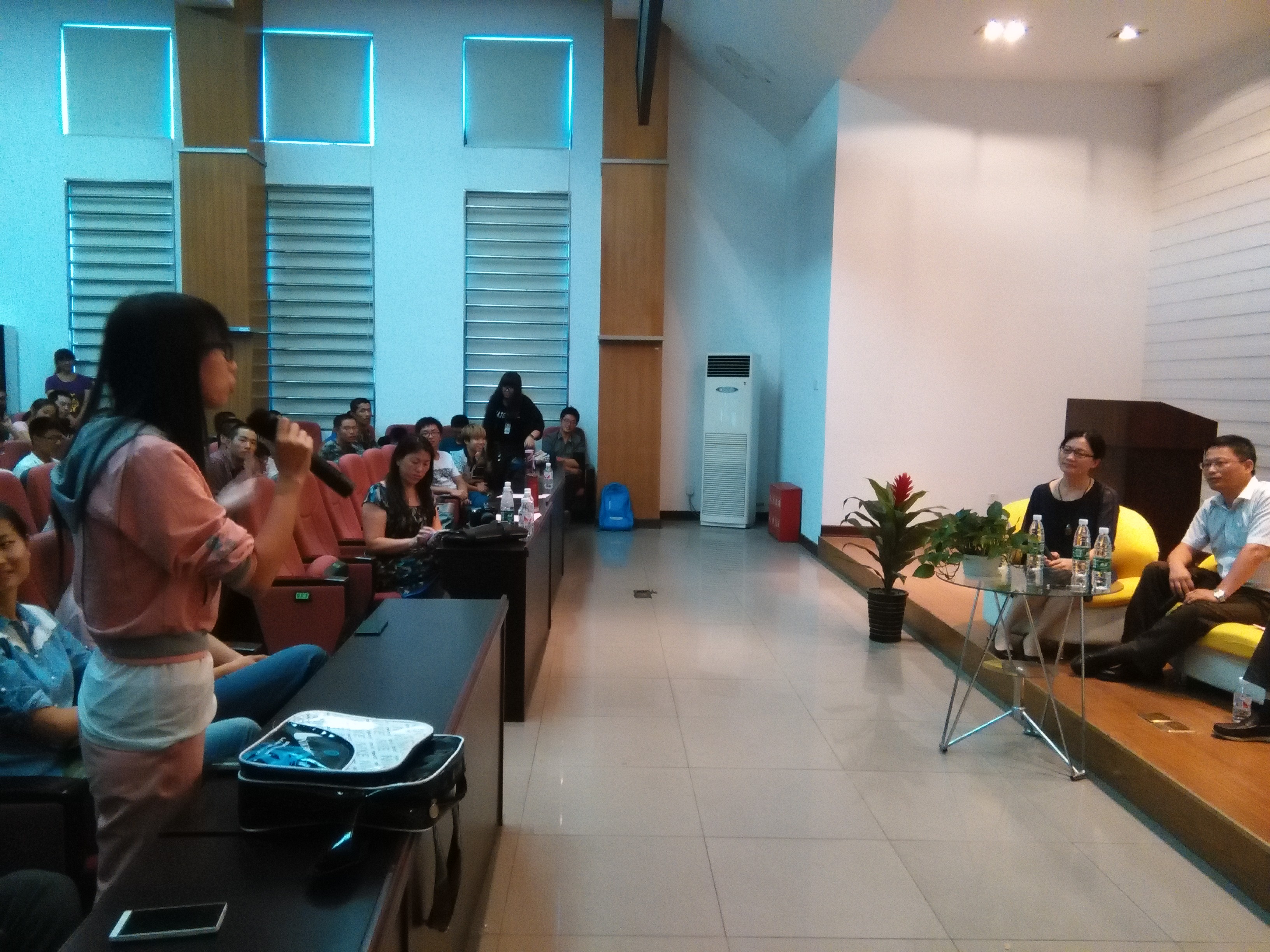 访谈开始后,吴天忍与三位校友展开充分交流。当谈到他们如何度过自己的大一时,彭天剑学长说自己上大学那会条件还不是很好,没什么社团,所以他们娱乐的场所最多的就是操场。他当时身体素质很好,多次获得省级、校级和院系的短跑第一名,说到这他强烈建议现在的大学生要多加强身体锻炼。彭学长则表示,自己将近五十岁还能有这么多精力去创立公司是跟他强健的身体素质是分不开的。所以他一再强调身体是革命的本钱,而夏丽娟学姐更是我们学习的榜样,年轻的她,连续978个仰卧起坐的记录,直接震惊全场,令人敬佩不已,感谢学长学姐为大家做了出色的榜样。