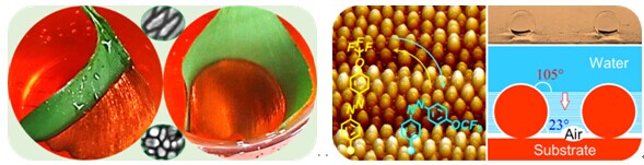 潘帅军依据“仿生学”的原理,首先从银杏叶向阳面和背光面迥异的表面润湿性出发,通过建立数学模型和理论分析,以新的科学视角首次揭示了银杏叶表面的微观形貌和润湿性的定量关系;然后以此为理论依据,利用化学手段对材料表面微观物理结构进行有效调控,首次研发出对几乎所有液体都具有超强排斥作用的聚合物纳米复合涂层;进而通过表面微观化学结构的巧妙设计,首次实现了材料表面润湿性的动态智能光化学调控以及对溶剂的智能选择润湿性。