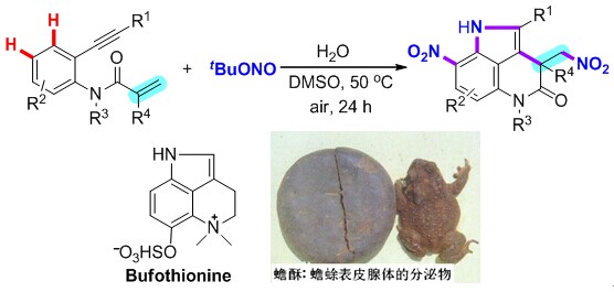 例如Bufothionine(蟾酥硫宁)是一种从蟾酥表皮腺体的分泌物提取的中药药材,主治小儿疳疾,脑疳等。有机合成该类化合物很复杂,需要多步反应,总产率低。该课题组巧妙的利用C-H氧化偶联反应方法,一步串联反应合成该类似物。研究实验结果发表在Angew. Chem. Int. Ed.(2014, 53, 9017)期刊上。