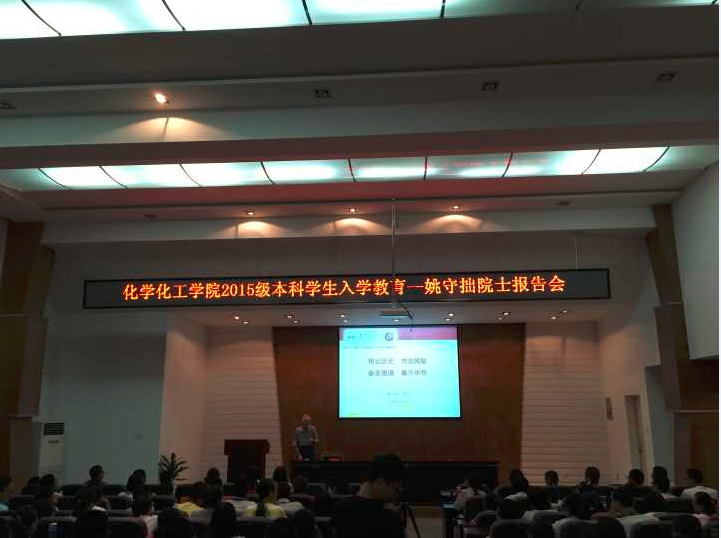 面向2015级新生开设的开学讲座第一讲由姚守拙院士发言。化工院报告厅今夜座无虚席,无数学子打算聆听先生的教诲。