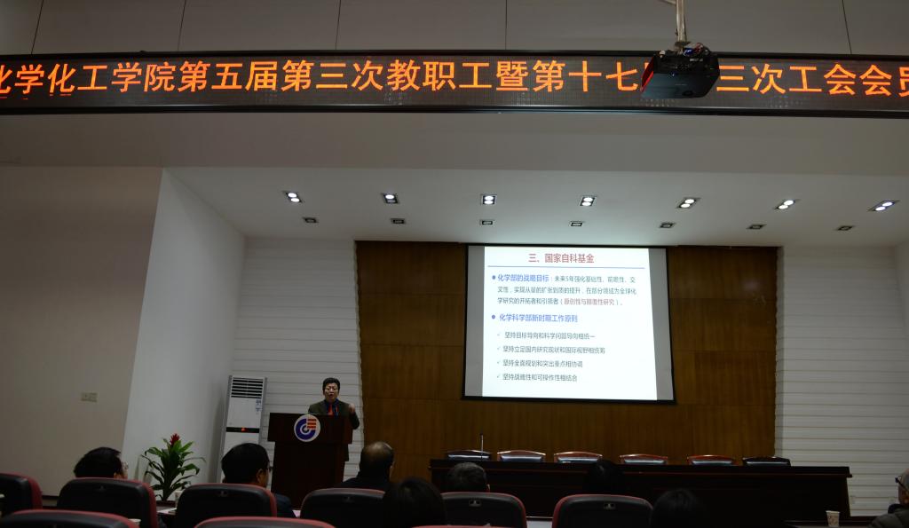 于2018年1月10下午在化工院D区大会议室举行了申报动员大会,副院长尹双凤教授向全体教职工作动员报告。尹院长先回顾了本院2017年取得的科研成就,盘点分析了本院教师在过去三年申报与被资助的科研项目以及获得的奖励荣誉,也指出经典三级