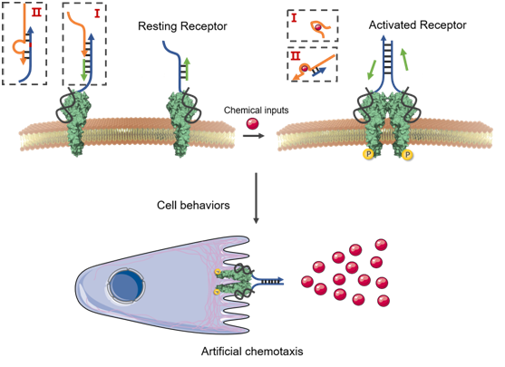 聂舟教授课题组开发了一种基于DNA纳米机器的受体非遗传改造策略,对细胞膜表面受体特异性进行定制化改造,通过DNA纳米技术赋予其化学小分子响应性,实现了小分子调控的细胞行为。该策略应用DNA介导化学诱导二聚(D-CID)实现了受体酪氨酸激酶的二聚激活,并介导下游的细胞信号传导途径,可对细胞迁移行为进行精确控制,无需复杂遗传改造即可赋予细胞特定的化学趋向性。进一步通过不同的DNA功能模块组合,并利用微流控装置构建复杂多细胞环境,成功证明了该策略可用于多目标细胞行为的多化学因子精准正交控制,有望实现在复杂细胞环境下对特定靶细胞类型的智能行为调控。D-CID策略由于其DNA识别单元的多样性,因此具有小分子配体及对应细胞膜受体的普适性。这种细胞行为的智能化调控策略有望为细胞治疗及再生医学的体内应用提供一种新思路。(Angew. Chem. Int. Ed., DOI: 10.1002/anie.201806155)
