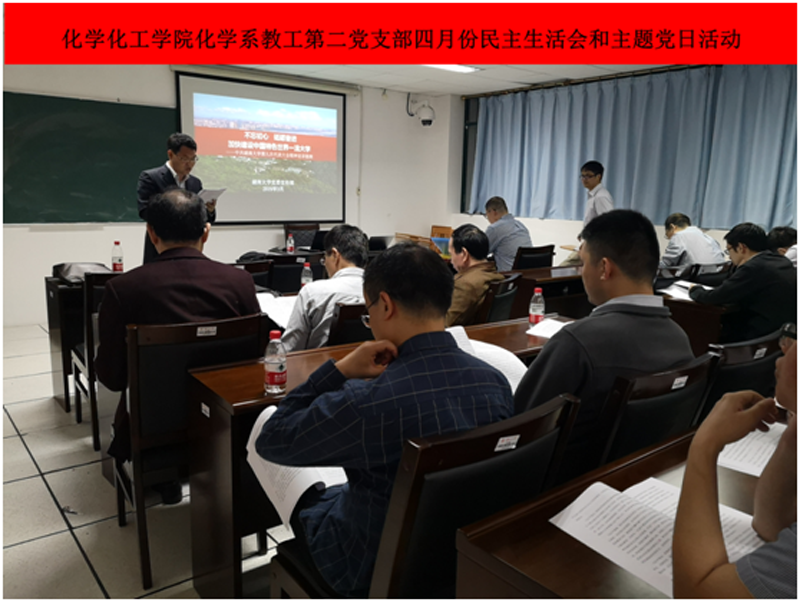 化学系教工第二党支部在新化工楼C区205会议室召开2019年四月份民主生活会,并正式启动支部定点扶贫基金。