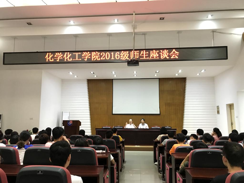 本科2016级师生座谈会在新化工院D区报告厅举行。本次座谈会邀请到了学院院长张晓兵教授、学院党委副书记范媛吉老师和学院副院长聂舟教授进行交流和答疑,座谈会由本科2016级辅导员刘王楚齐老师主持。