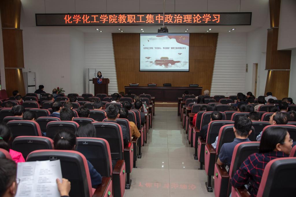 召开全院教职工大会,开展“不忘初心 牢记使命”主题教育集中政治理论学习。学院党委书记王玉枝教授和学院党委委员、化工应化党支部书记邓剑如教授分别作了宣讲,学院党委副书记范媛吉主持会议。