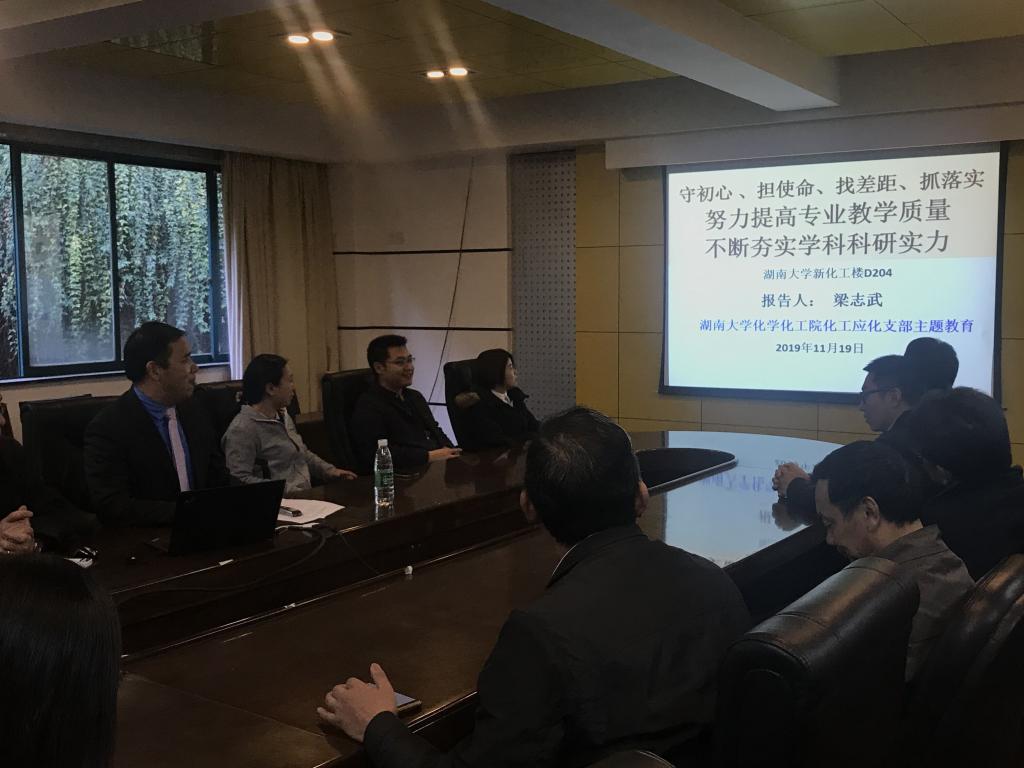 党支部全体同志在学院新楼D区204会议室开展了党政学习交流。会上,副院长梁志武教授作了《守初心、担使命、找差距、抓落实-努力提高专业教学质量,不断夯实学科科研实力》的专题党课。梁志武带领大家一起回顾了学院发展历史,以及化工应化专业的发展现状,并指出正是由于一代代老师和前辈们 “不忘初心”的努力和“牢记使命”的责任感,才有了我们现在经典三级