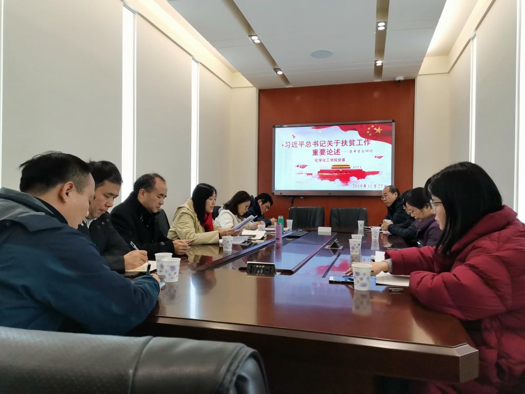 王玉枝指出党的十八大以来,以习近平同志为核心的党中央把脱贫攻坚摆到治国理政突出位置,提出精准扶贫方略,全面打响脱贫攻坚战。党的十九大进一步把精准脱贫列为全面建成小康社会三大攻坚战之一作出部署。为了全面打赢这场攻坚战,习近平总书记亲自挂帅、亲自研究、亲自部署、亲自推进、亲自督战,锲而不舍抓扶贫,充分彰显了我们党不忘初心、牢记使命、为民造福的大情怀大担当。王玉枝带领大家从习近平扶贫思想的形成过程、科学内涵、历史贡献三个方面进行了认真学习,并回顾了学院党委和各党支部在学校定点扶贫单位隆回白水洞村开展的工作情况,要求大家自觉用习近平总书记关于脱贫攻坚重要论述精神指导实践,推动后期扶贫工作,确保如期打赢脱贫攻坚战。