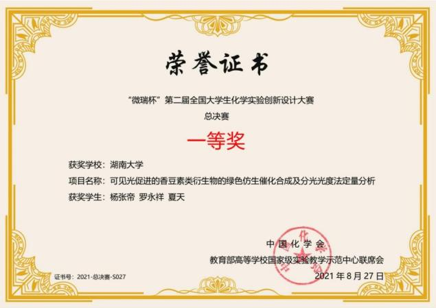 2018级本科生罗永祥,2019级本科生杨张帝、夏天在第二届全国大学生化学实验创新设计竞赛全国总决赛中荣获一等奖,学院王兮教授担任指导老师。这是该竞赛创办以来我校首次进入总决赛并获得一等奖。