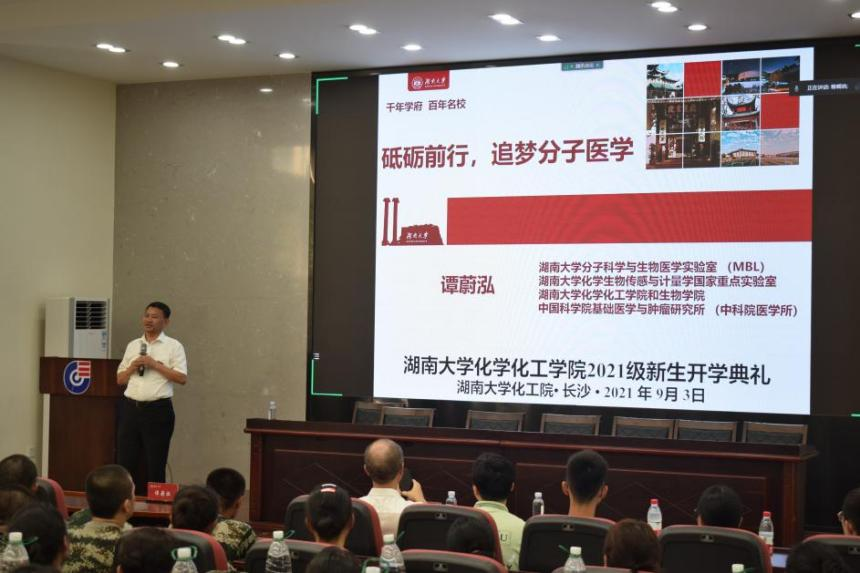 化学生物传感与计量学国家重点实验室主任谭蔚泓参加,院长张晓兵主持。2021级本研新生辅导员及全体新生参加会议。