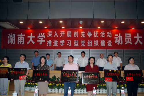 、材料科学与工程学院、经济与贸易学院、机械与运载工程学院现代设计系等作基层党委和党支部代表发言,介绍基层党建工作经验。大会还对计划财务处、教务处、党委统战部、学生工作部、图书馆、岳麓书院和招生就业指导中心等首批经典三级