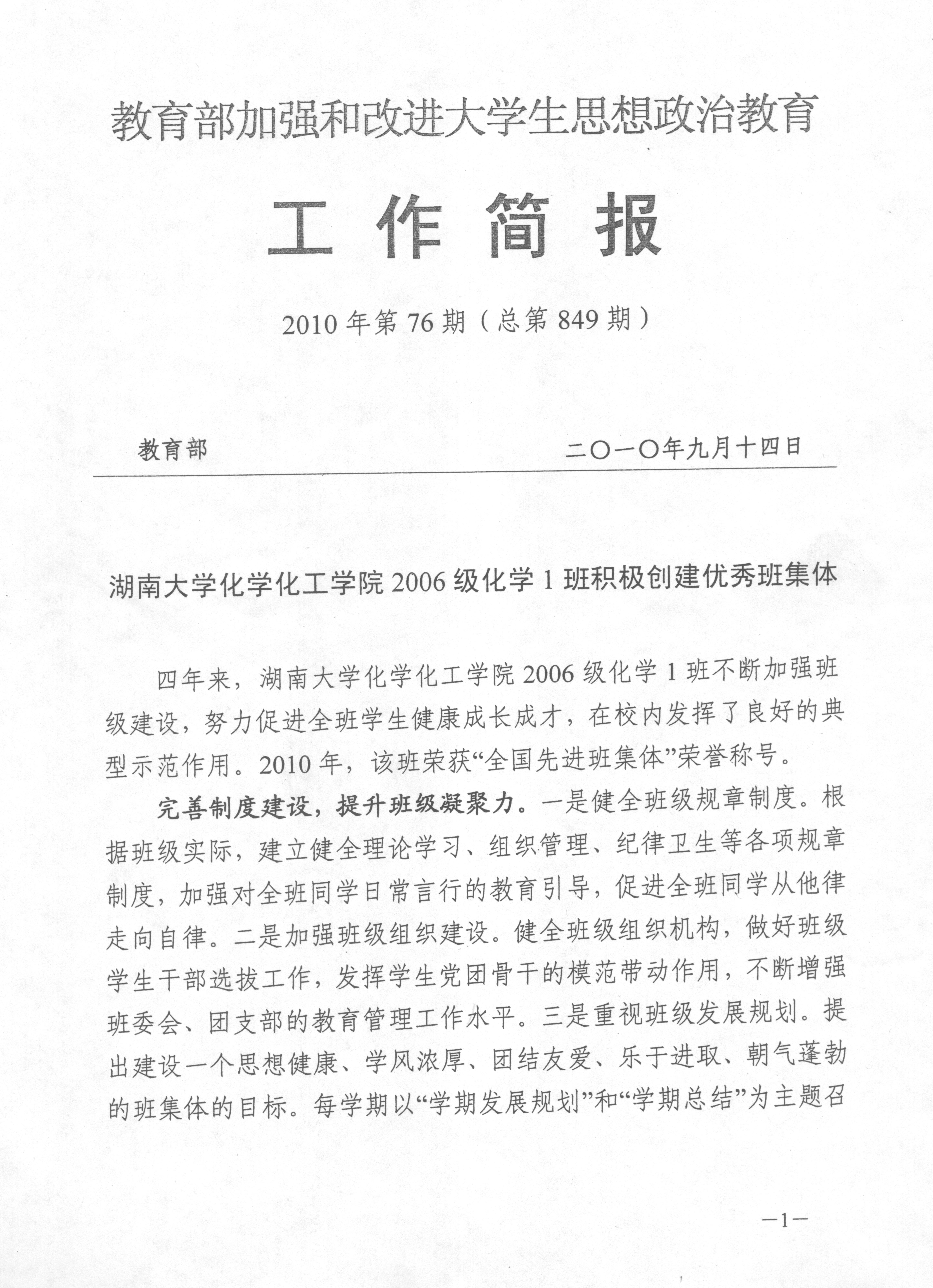 教育部工作简报:经典三级 2006级化学1班积极创建优秀班集体