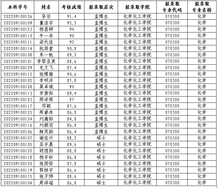 根据教育部及学校关于“强基计划”学生转段研究生相关规定,经学生申请、学院考核,现将经典三级 接收2022级“强基计划”学生本研转段考核结果予以公示,公示期为2025年9月24日-9月27日。如对拟录取名单有异议,请于公示期内向化学化工学院书面反映。