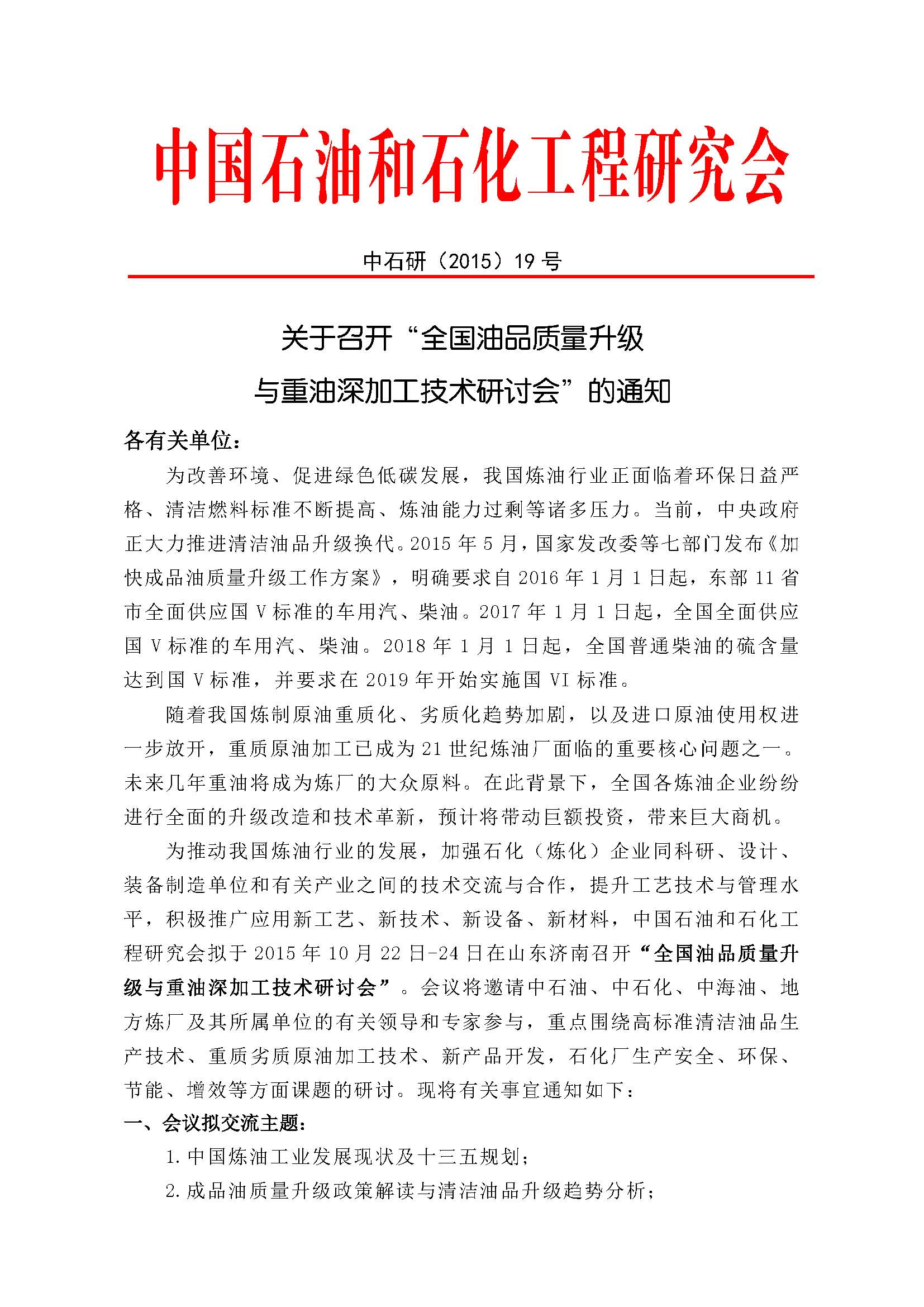 全国油品质量升级与重油深加工技术研讨会通知